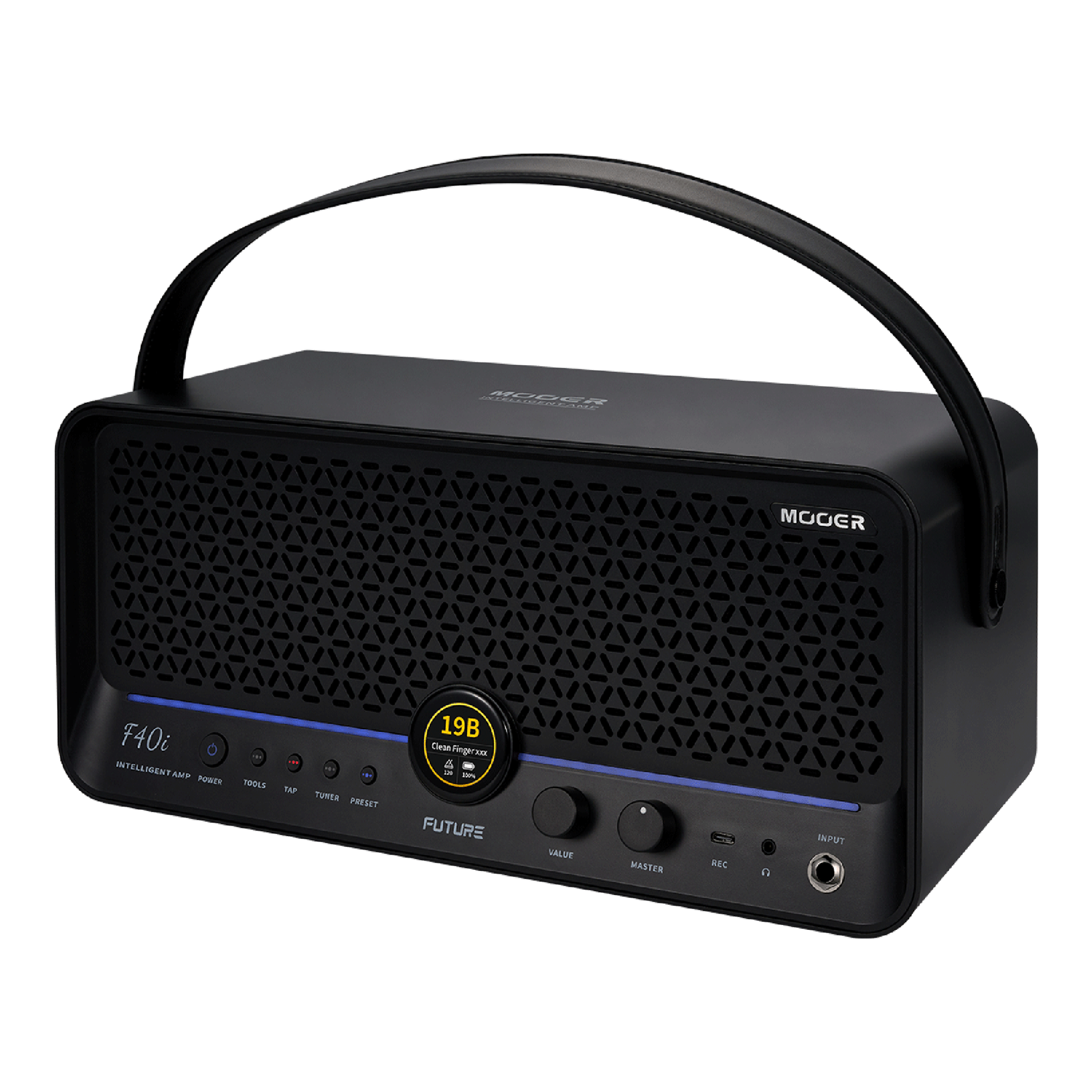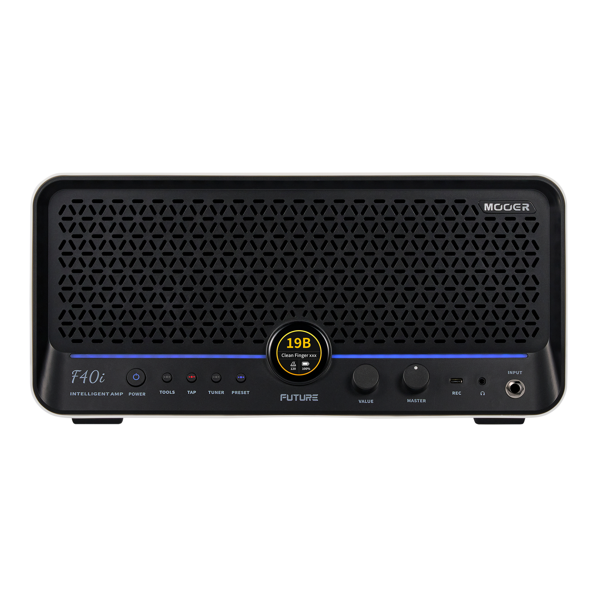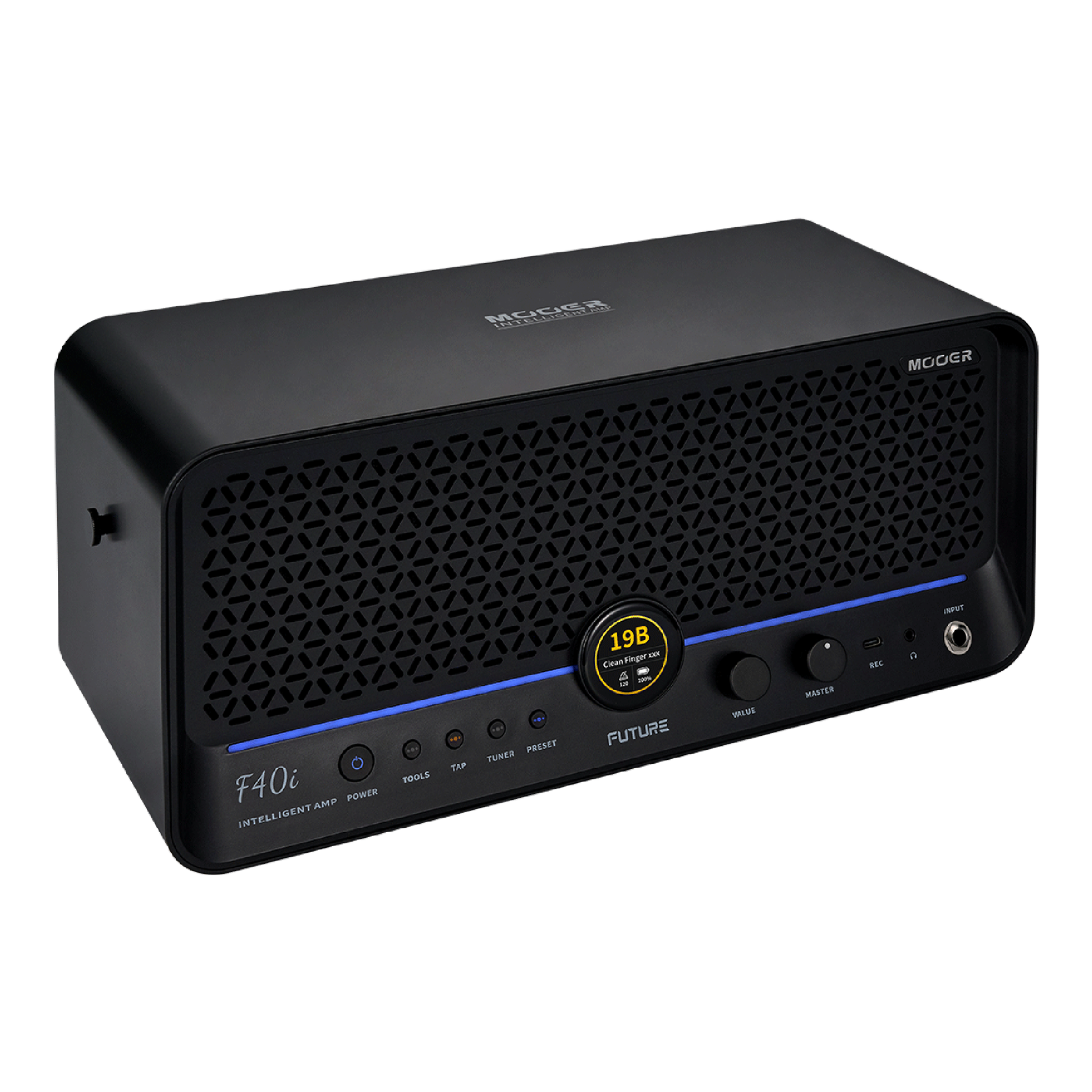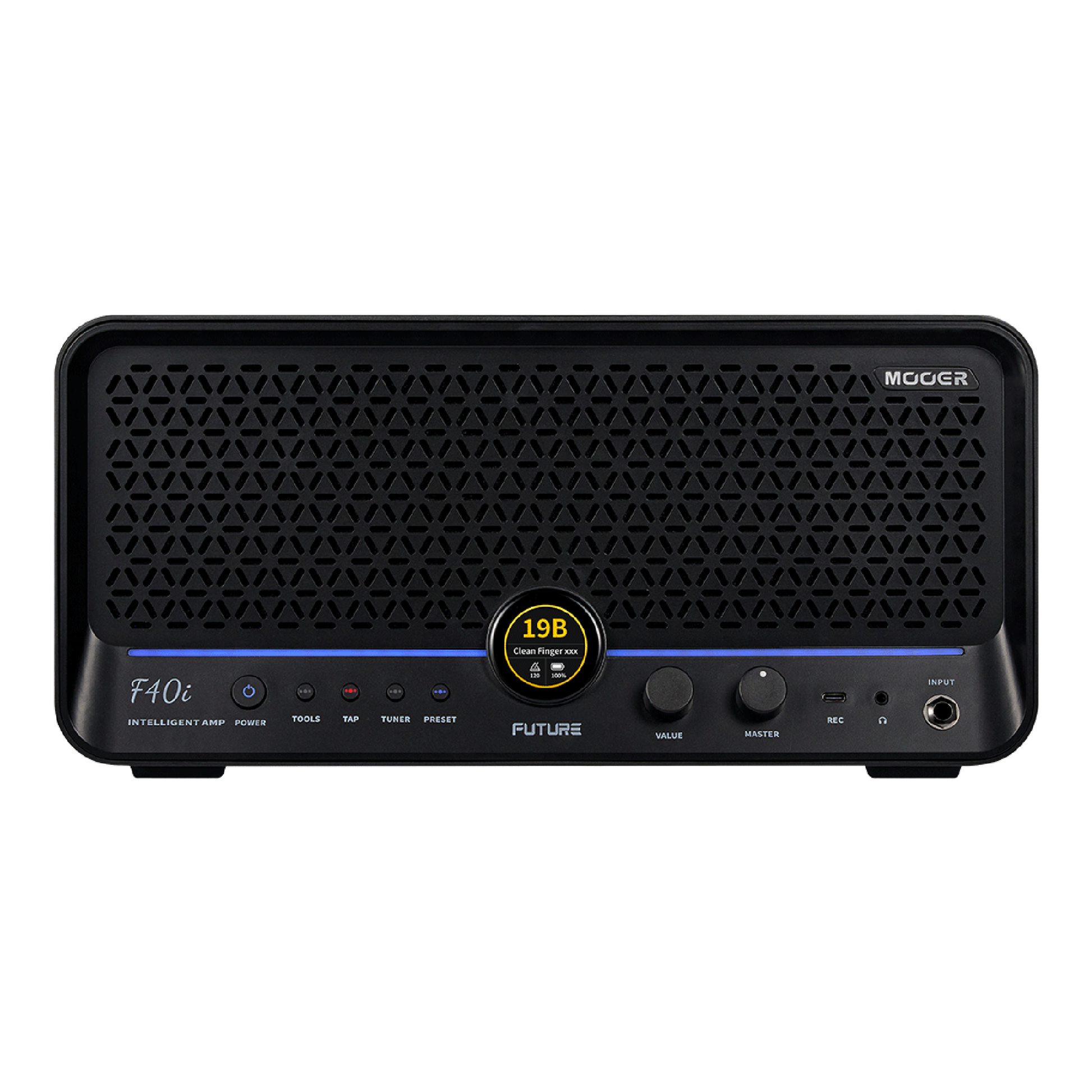 Mooer F40iは、多彩なアンプモデルとエフェクトを組み合わせたトーンをアプリから設定して操作できるデスクトップアンプです。本体にタッチスクリーンを備え、快適な操作が可能。